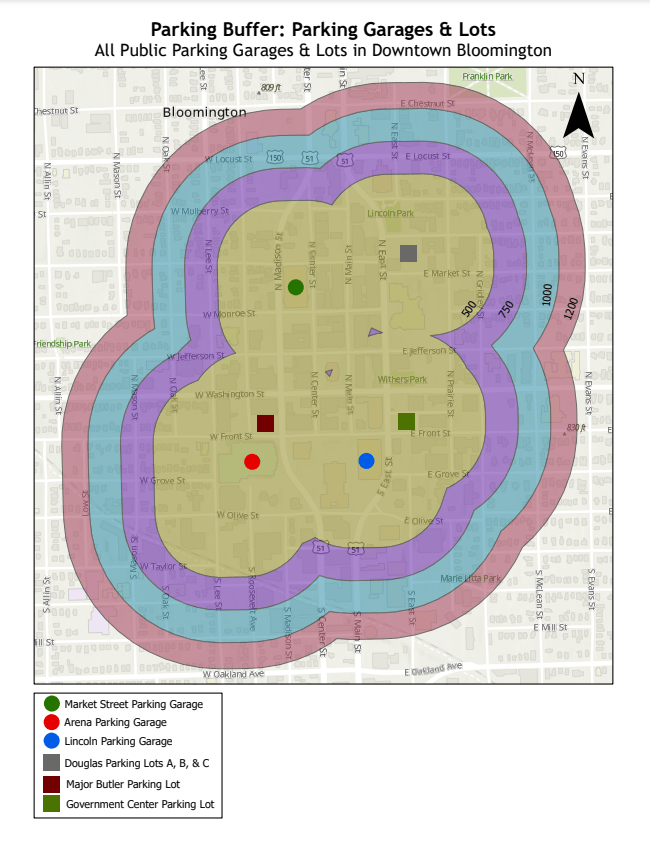 If a new development is within 1000 feet of public parking, they can substitute 3 public parking spaces for every one required off-street parking space. As shown by the map below created by city staff, this essentially reduces parking requirements in downtown and the near neighborhoods.
