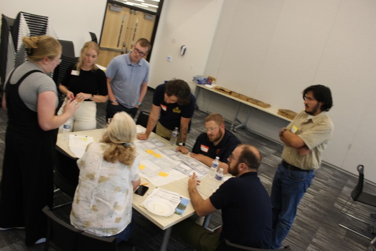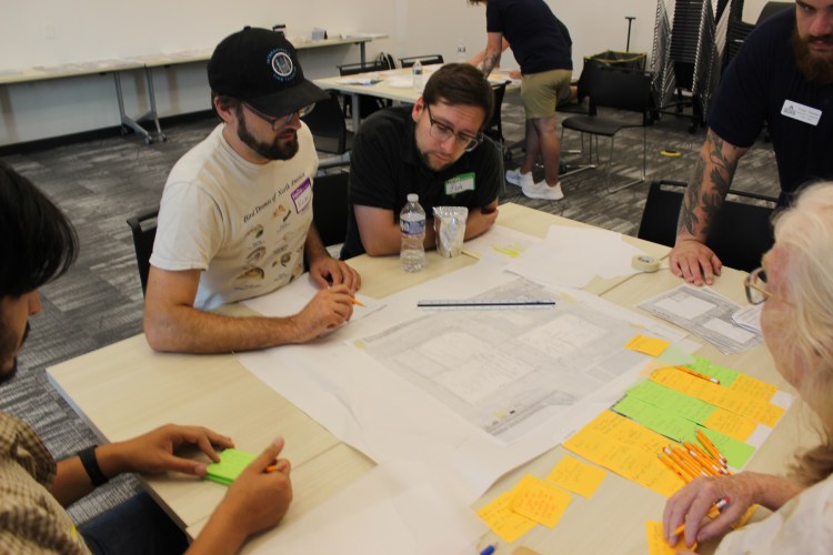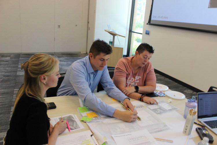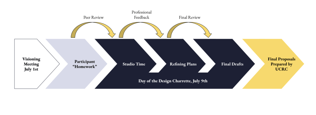 The charrette had three short feedback loops designed to improve the overall site plans: peer review where participant “homework” is synthesized into one group plan, professional review by engineers, urban planners, and economic development specialists on the feasibility of certain ideas, and final review where each group critiqued each other’s work.