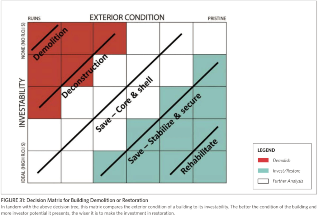 When applying this decision framework to our local context, the Historic Preservation Commission should not be the only actor involved in this process. Ideally, the city should be proactive in identifying buildings and parcels that are at risk of abandonment, work with owners on strict and recurring code enforcement to ensure that buildings do not get to the stage of decay that would require demolition or deconstruction.
