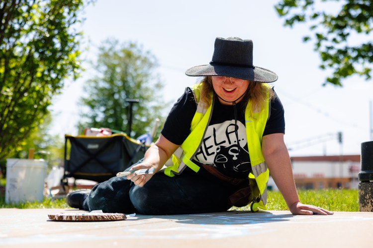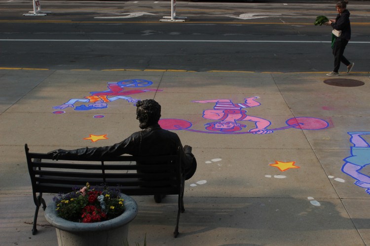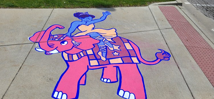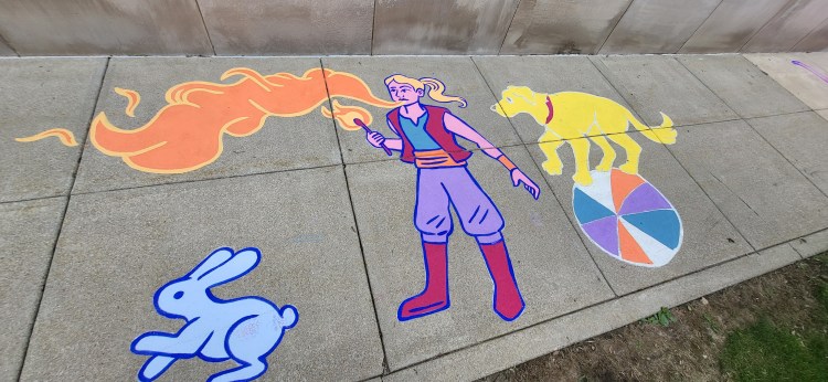 We have completed a beautiful set of circus themed murals between the Bloomington Public Library and downtown Bloomington. This acts as a way to encourage pedestrian activity between the two nodes, foster a sense of civic pride, and draw attention to our circus roots. Artist Delia Kerr-Dennhardt and an army of volunteers worked tirelessly during the entire month of May to install these! Over 160 volunteer hours have been clocked!