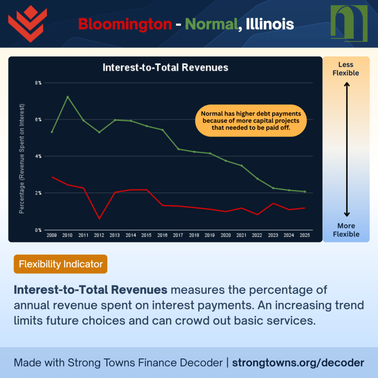 As for the Town of Normal, the higher percentage of the revenues paid for interest payments and other financial metrics appear worse than Bloomington on some of the charts. Normal has done comparatively more than Bloomington in efforts for redevelopment of downtown Normal into the destination it is today, “Uptown.” The New Urbanist mantra of walkability and placemaking are noble causes and a better agenda to spend on than endless sprawling subdivisions (which Normal also has a ton of), but this is where Strong Towns and the New Urbanists diverge.