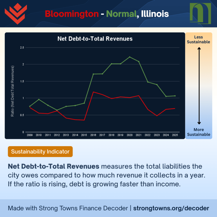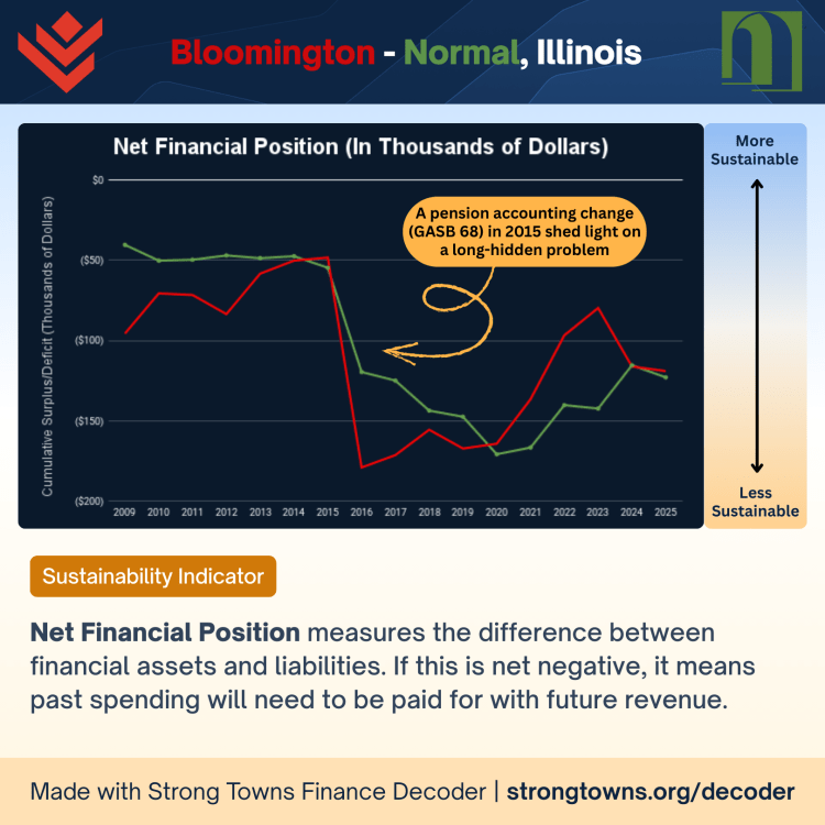Every year, municipalities release an Annual Comprehensive Financial Report, which is completed in a standard format for all American and Canadian cities according to agreed-upon government accounting practices. That makes it easy for the national organization of Strong Towns to create a tool to analyze these documents and chart the topline numbers in a way that the general public can understand. We’ll inspect the results for both Bloomington and Normal, give our commentary. Afterwards we’ll describe how we found these numbers, and what our communities should do to in order to improve their financial standings into the future.